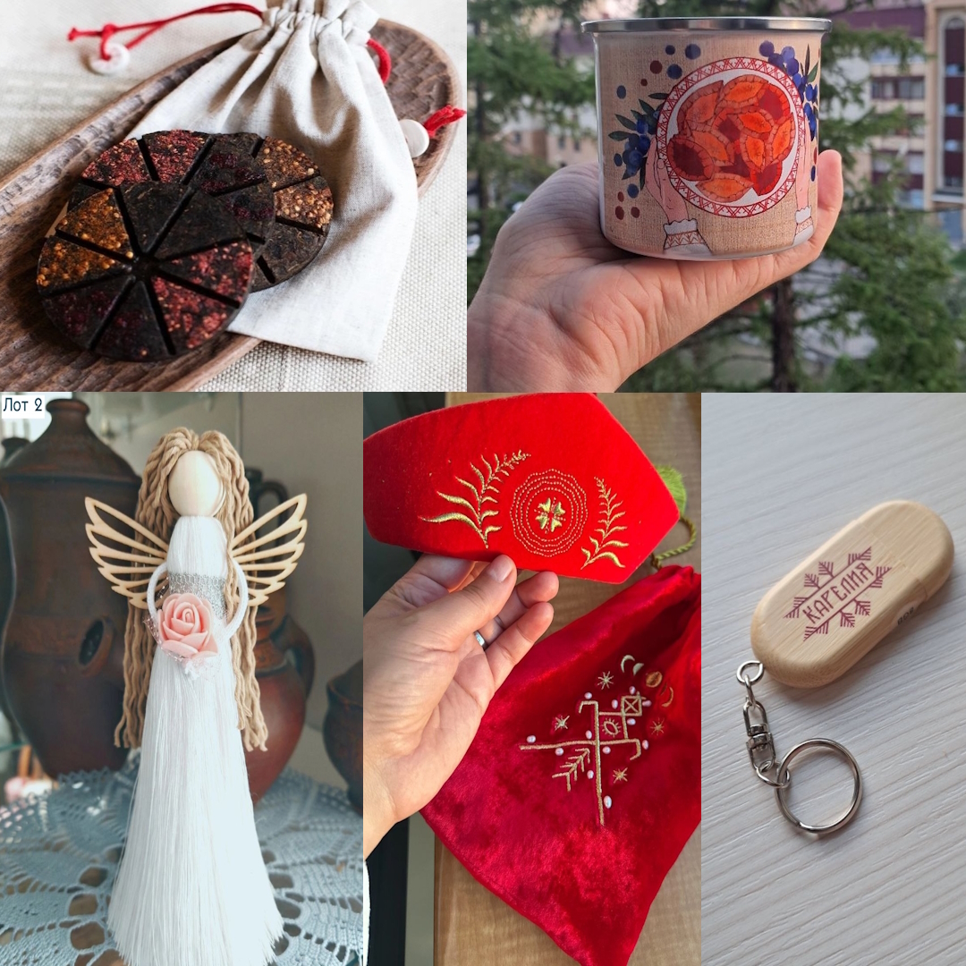 Первый комбинированный лот – это металлическая кружка с изображением калиток, прессованный иван-чай, собранный в полях старинной карельской деревни, а также кокошник с вышитыми изображениями иван-чая от «Love.karelia», студии подарков и впечатлений из Карелии. Часть вырученных средств студия направляет на поддержку карельских деревень, а в этот раз решила поддержать нас